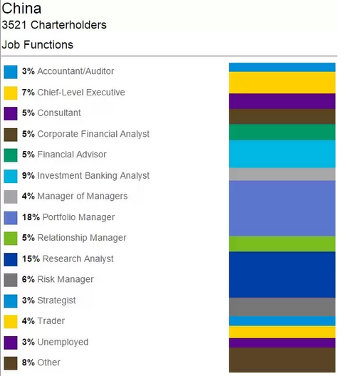在中国大陆拥有较多 CFA 特许资格认证持有人的雇主包括普华永道、中国银行、中国工商银行、中国国际金融有限公司、汇丰银行、中国中信、法国巴黎银行、瑞银、德勤、安永会计师事务所、中国平安保险、招商局集团、国泰君安证券股份有限公司等。