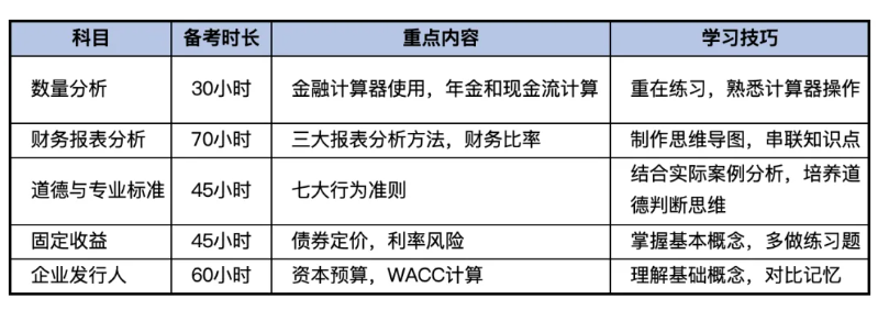 按照实际考试时间做模拟题(Mock),严格卡时间作答。考后一道一道分析错题,查漏补缺。复习错题本,重点记忆公式和道德准则。保证你会的那些基础题不丢分。