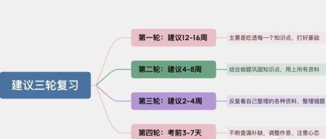 具体复习节奏上,建议安排3轮复习(有条件可以4轮),第一轮12-16周左右时间,第二轮4-8周左右时间,第三轮2-4周左右时间。以25年2月考季为例,第一轮在12月之前完成,第二轮在1月之前完成,2月之前完成第三轮。