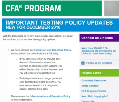 先进次看到这个东西小编感到很奇怪,一个12月考试才生效的东西,你6月份发干毛?于是乎给CFA协会打了一个电话.对方确认以上更改对16年6月考试的考生也生效,所以各位16年12月考试的各位注意了,以上修改部分已经在6月份成功实行了一次,意味着以上规定正是今年12月份需要遵守的内容!