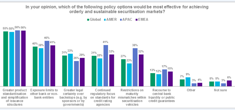 Given the current focus of securitisation and securities financing transactions within the international policy sphere, the CFA Institute report examines the perspectives of investment professionals on these (and other) issues via survey. Notably, more than half of investment professionals surveyed identified greater product standardisation and simplification of issuance structures as the most effective policy option for achieving orderly and sustainable securitisation markets.