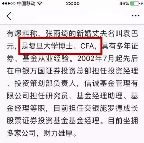 张雨绮闪婚的新闻刷爆了盆友圈,各路媒体深扒其老公的背景,结果总结出了三个关键词:复旦大学博士、CFA、基金经理!