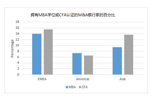2.M&A领域的银行家中,在EMEA(欧洲、中东、非洲)地区以及APAC(亚太)地区,持有CFA的比较普遍,而MBA在美国较为常见。