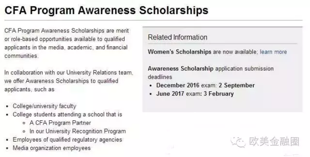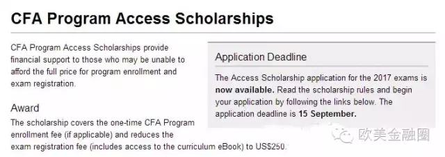 包括承担考生一次性的CFA课程注册费(如适用),并减免考试费(包含电子版教材)至250美元。AccessScholarships申请截至2016年9月15日,有任何关于CFA奖学金申请的问题可以邮件咨询:scholarships@cfainstitute.org