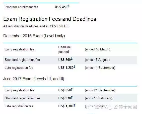 ●如果你想报名2016年12月份CFA考试,目前先进阶段已经截止了,但是你可以抓紧时间在第二阶段(2016年8月17日)或者第三阶段(2016年9月14日)截止前报名也是不错的,这是考试费用略有增加。因为协会是采用的早报名早优惠的政策机制,如下图;