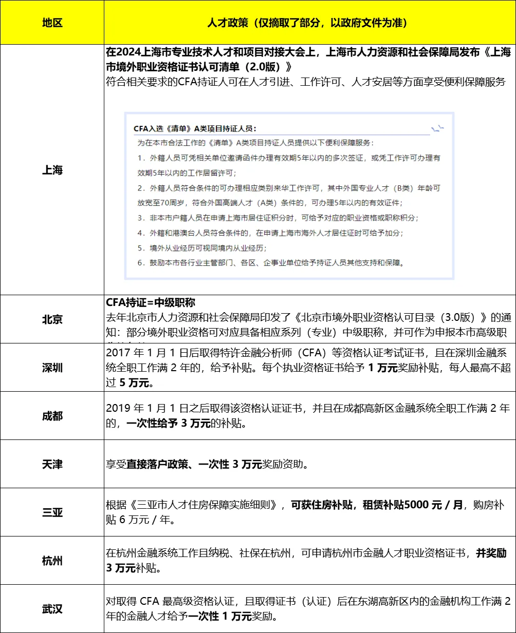 此外,北京、上海、广州、深圳等20余省市地方政府已经发布了针对CFA持证人的人才吸引或支持政策(包括不限于以下):