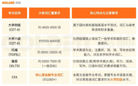 而在剩下的25%的“读”的能力中,最关键的是词汇量。但CFA真正要求的词汇量并不大。我们以大学四六级、托福雅思和CFA的词汇要求为例,做一个对比(以下数据来自DeepSeek):
