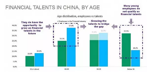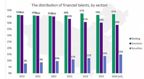 报告显示,自2010年以来,专业金融人才在金融行业中的 比例得到了快速上升,其中与银行和保险相比,中国证券业务金融人才增幅较大,占金融人才总数的比例从2010年的8%增至2016年的15%。对于银行业务的占比稳定,证券与保险业务的此消彼长,CFA协会中国会长贾立军先生解读说:“传统银行业务是国家命脉,但随着金融资本市场的成熟与国际化,投资管理很大程度上就在证券业务发展中得以体现。”