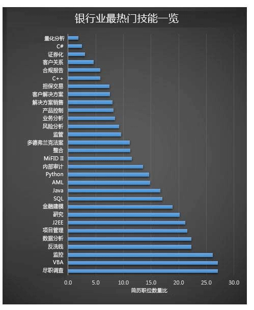 调查中发现的另外一项热门技能是监管技能。随着外汇丑闻的不断出现,以及银行为了符合法律要求而需要提供合规报告,这一技能变得热门也是合情合理的。