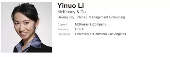 (LinkedIn Member):李一诺, 96级清华本科,UCLA生物学博士,CFA,6年成为麦肯锡全球合伙人。