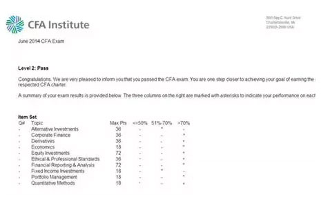 CFA统计时将正确率分为三档:<=50%,51%-70%,>70%,并且给出了每一部分的正确率属于那一档,较后会直接告知考生是否通过,至于具体的答对题数,CFA不会公布。每一个级别都是类似的,只是各个级别的通过率不尽相同。