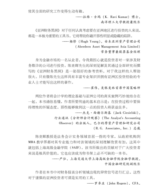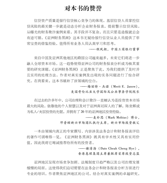 《亚洲财务黑洞》一书为揭示违规行为提供了分析框架。本书探讨了包括亚洲地区的特殊规定在内的国际会计报告准则。陈竞辉和罗宾臣在学术界以及亚洲财务方面的综合背景,使他们拥有了多样化的研究视角,并令他们成为该领域的专业。