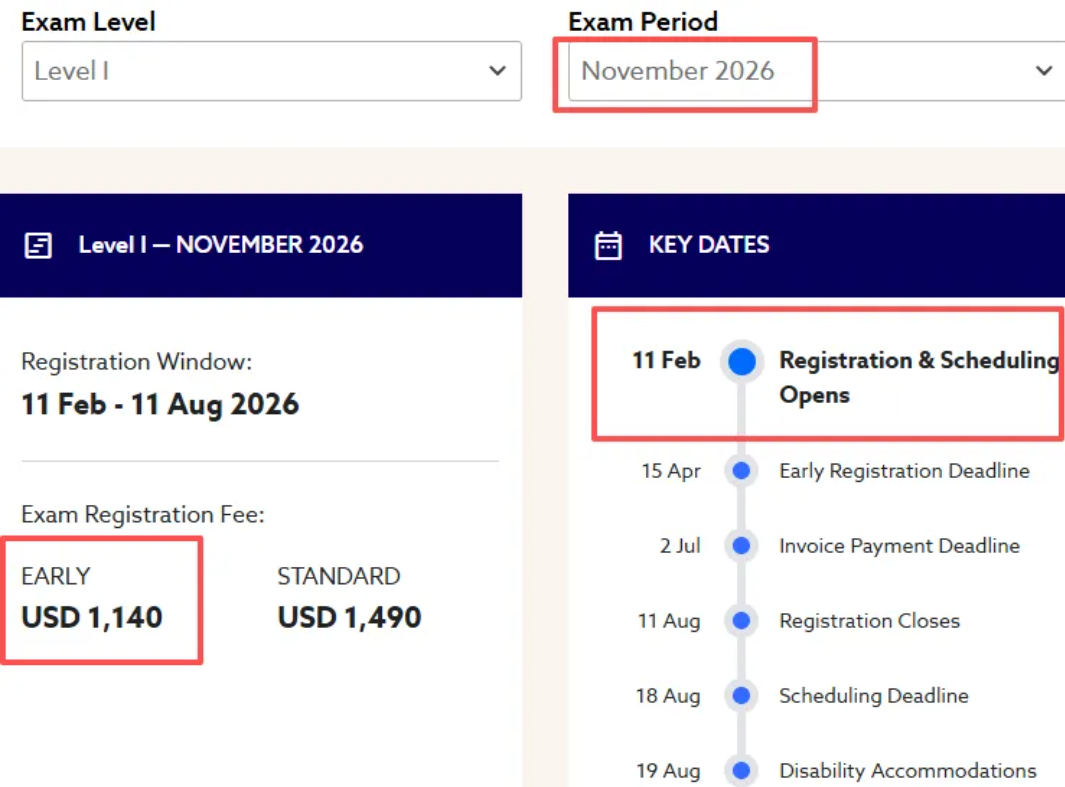 2026年11月CFA考试早鸟阶段报名窗口正在进行中:适用于CFA一、二级考生,截止日期:2026年4月15日晚11:59。