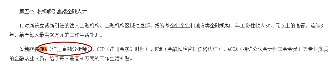 2.新获得CFA(注册金融分析师)专业资质的金融从业人员,给予每人最高50万元的工作生活补贴。