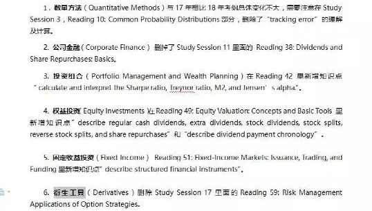 CFA一级方面,在伦理道德与专业准则 、经济学 、财务报表分析 、其他类投资等考纲内容与17年相比基本没有变化,变动主要发生在数量方法、公司金融、投资组合、权益投资、固定收益投资、衍生工具等方面。