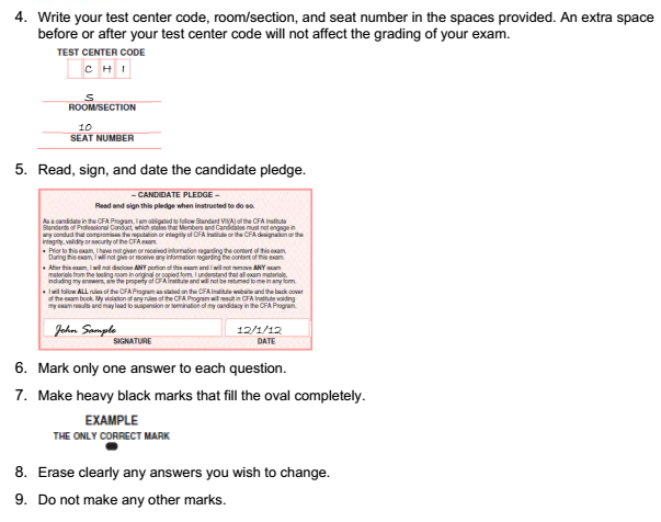 写下您的CFA协会ID和座位号在考试册的封面。