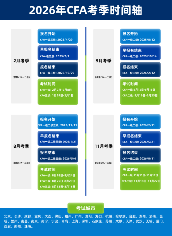 报名CFA一级考试时选择的考试窗口须处于学士学位课程或同等项目毕业月份前23个月及以内。例如,四年制本科在校生最早可以在大二暑假参加一级考试。
