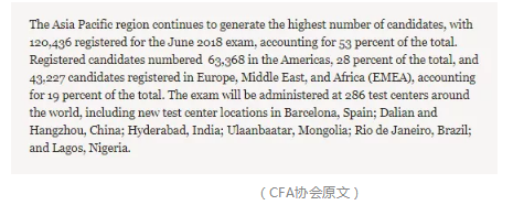 日前,在CFA官网上看到了它的一篇报告,公布了最新的2018年6月的CFA全球报考情况。报告中,在报名人数增长率上,协会给出的数值是:20%!