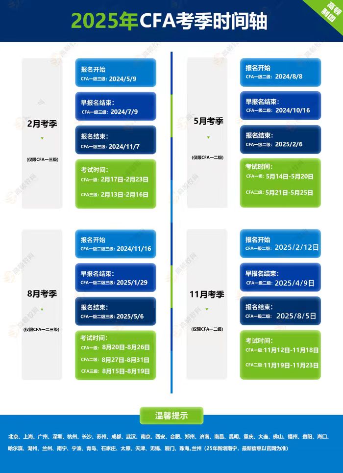 2025年CFA考试依旧是2月,5月,8月和11月四个考期!