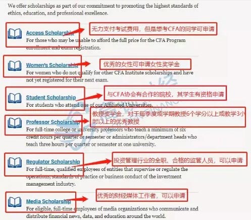 在CFA协会官网公布的奖学金申请项,主要有以下6种: