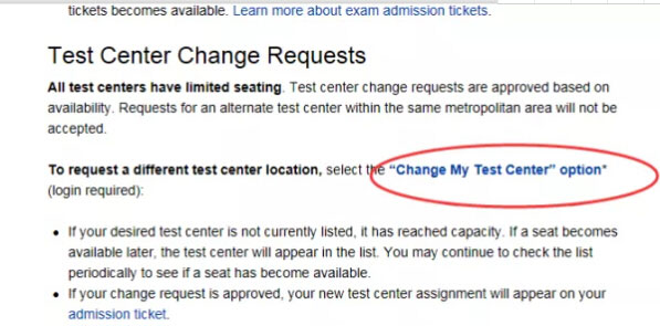 测试中心座位有限,请求根据可用性进行处理。所有更改请求必须在考试日历上列出的截止日期之前提交。不接受在同一大都市区内的备用考试中心的请求。
