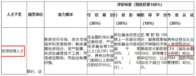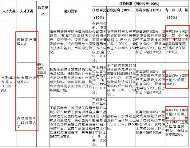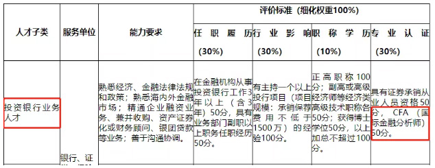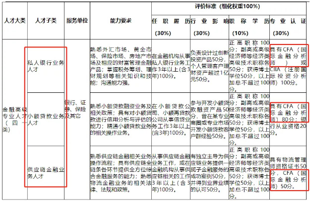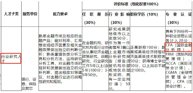 类高级金融人才的评价标准,将从任职履历(30%)、行业影响(30%)、职称学历(10%)、专业认证(30%)四个方面细化评分。从以上比例可以看出,高层次金融人才的评价标准中证书(专业认证)的占比为30%,占据很大分量。