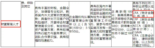 在40类金融人才评选标准中,CFA作为专业认证的评分标准共出现13次,为出现次数最多的专业资质认证,远远超过其他证书(5-6次)。