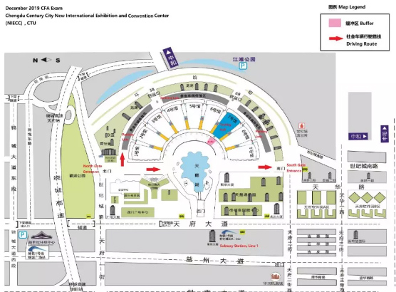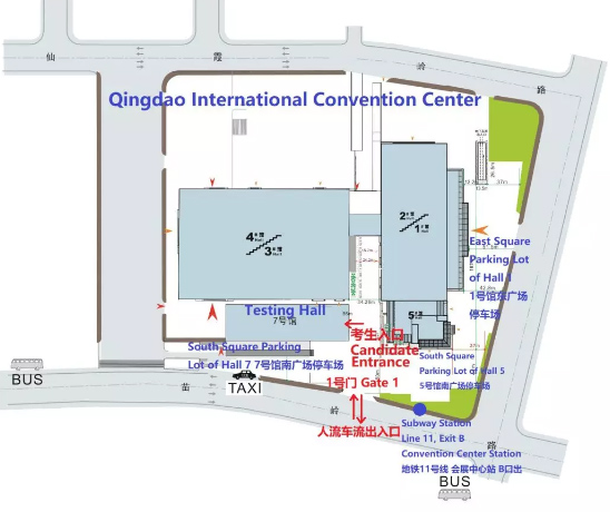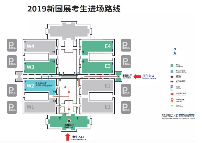 考生入口:考生应从南路口、东路口进入考场,将个人物品存放在W2号大厅,并前往指定的考场。详情请参阅位置图。