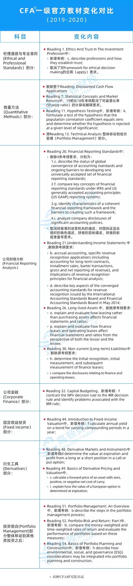 其次,考纲内容上,除了财务报表分析(Financial Reporting Analysis)、权益投资(Equity Investments)、其他类投资(Alternative Investments)、固定收益投资(Fixed Income Investments)四门科目考纲要求无变化,其余科目的考纲都有不同程度的内容调整。单科科目的考纲要求变化情况具体如下: