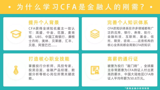 同时,CFA可以是金融行业职业转型、发展和进阶的“敲门砖”和“助推器”,人民日报、央视财经、人民网也多次称赞CFA是“十大高含金量证书之一”。