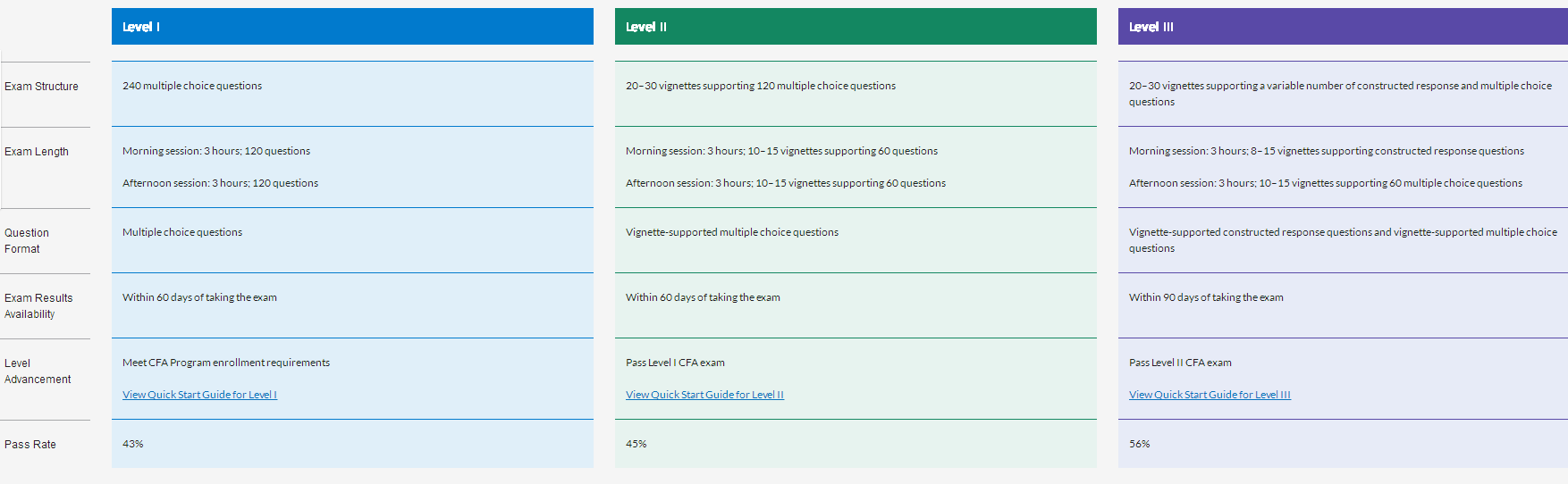 CFA考试总共三个级别,所有考生必须按照顺序参加考试,通过前一级别,才能参加下一级别的考试。其中LevelⅠ考试在每年6月和12月各举行一次;LevelⅡ,Level Ⅲ考试每年仅在6月举行一次,所以最快通过三个级别的考试至少需要2.5年。