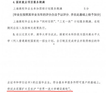 《办法》明确提出,将之前“以北京大学、清华大学为试点,探索建立对本科阶段为国内高水平大学的应届毕业生,符合基本申报条件即可落户”的政策,范围扩大至在沪“世界一流大学建设高校”。