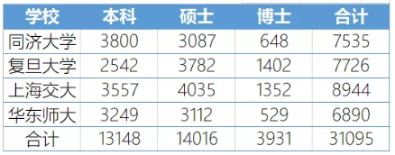 根据各校的2019年毕业生就业质量报告统计,上述四所高校2019年本科生毕业总数为13148人,本硕博毕业生总数为31095人,即便剔除整体占比较小的上海本地生源,那么这4所高校能落户上海的总人数至少破万,甚至更高。