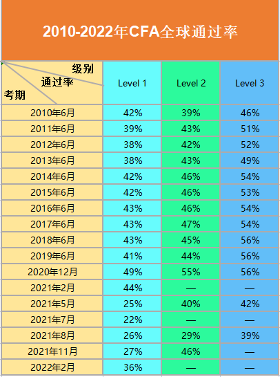 CFA协会也公布了2022年2月CFA一级考试的全球通过率,CFA二级考试的全球通过率还需要等待全部成绩公布之后,才可以统计出来。学姐也整理了一份2010-2022年CFA考试的全球通过率情况: