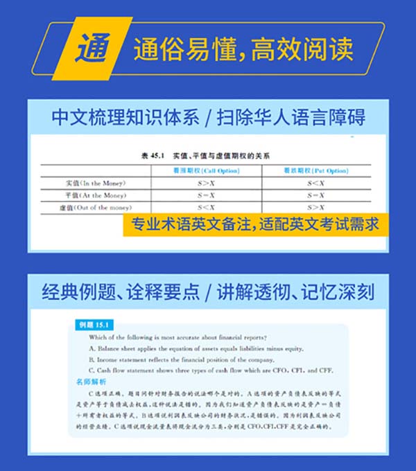 CFA协会推出了原版的英文版CFA教材,原汁原味的同时,也十分贴近考点,而考生在阅读教材时,也应考虑到个人实际,合理利用教材。如部分考生的英语水平较差的话,阅读原版CFA教材的难度比较大,往往在备考过程中比较头疼,效果也可能适得其反,如果阅读原版教材比较困难的话,也建议以中英文版教材作为参考: