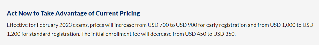 2、考试费(Registration Fee)早鸟报名阶段(由$700上调至$900)和标准报名阶段(由$1000上调至$1200),两个阶段还是相差300美元。