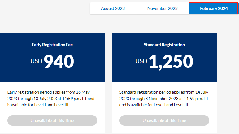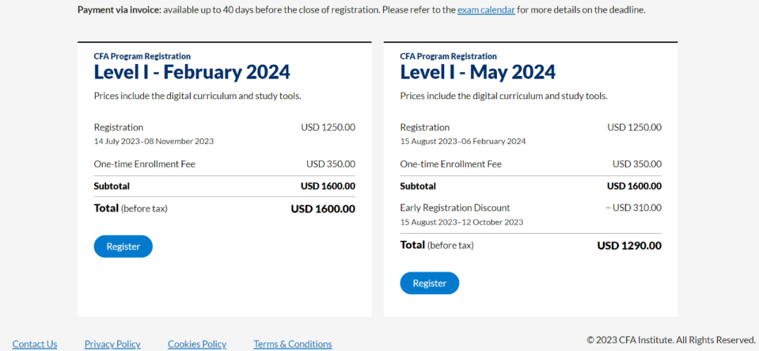 早鸟价报名:CFA一级、CFA二级考试:990美元;CFA三级考试:1090美元