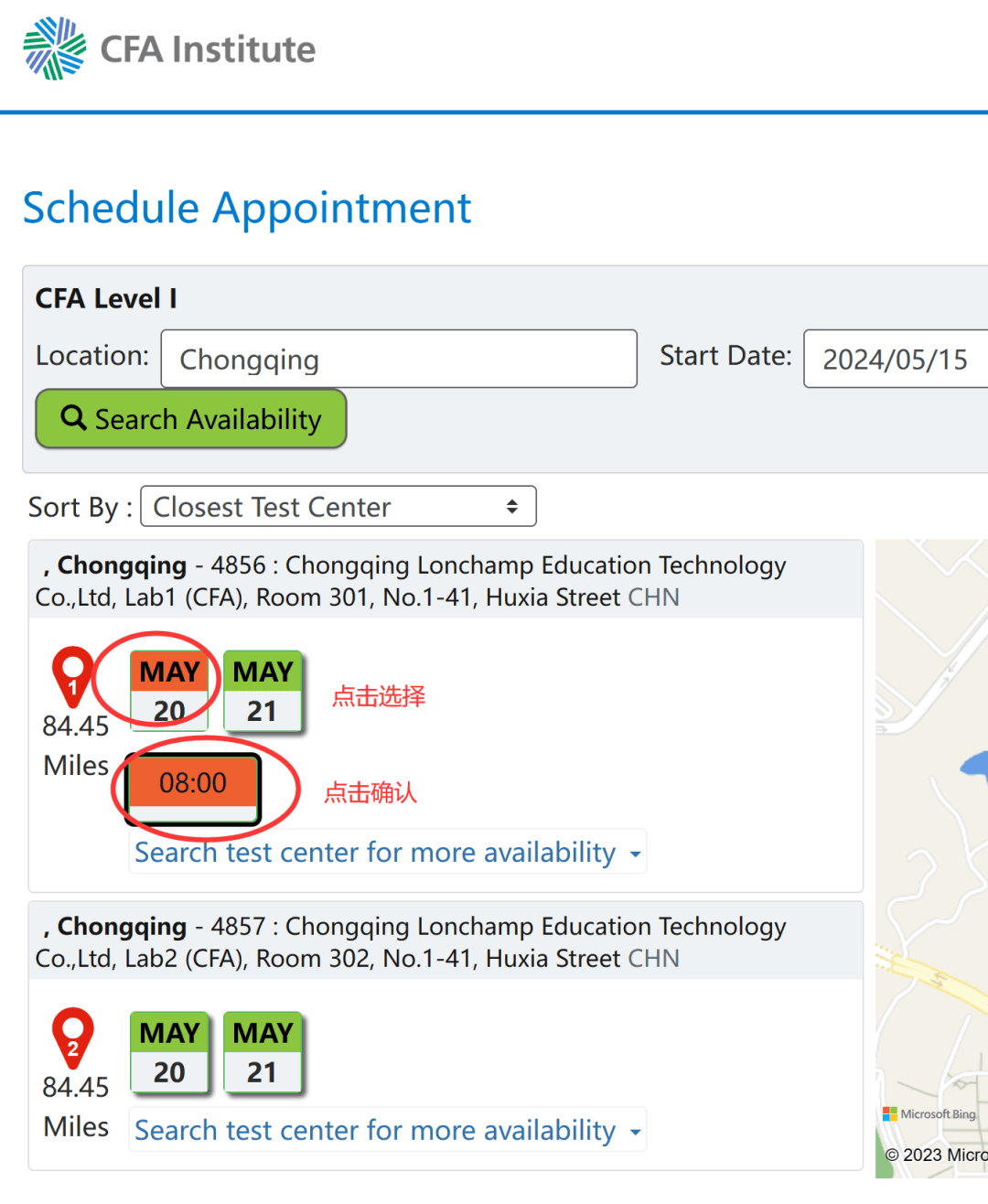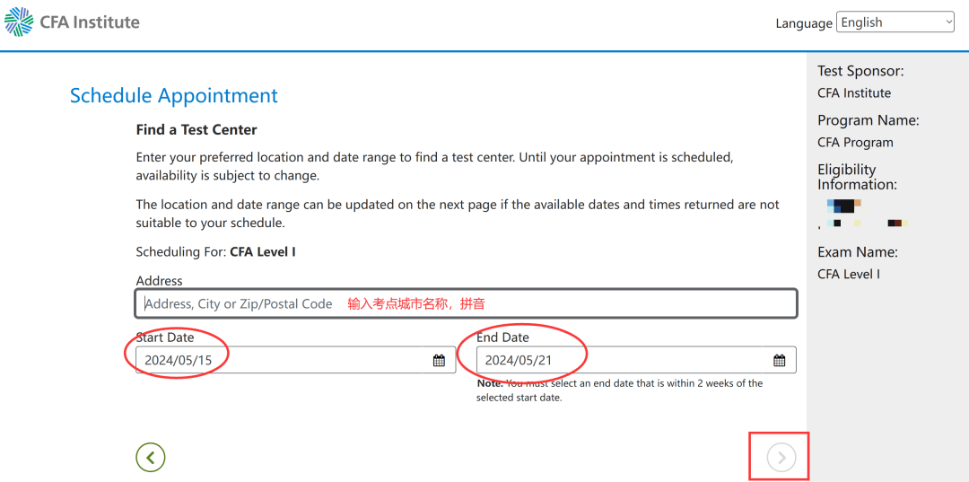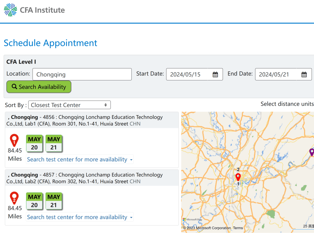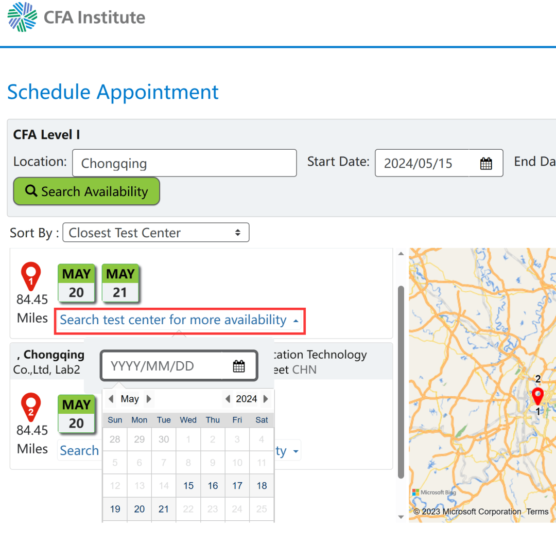 5.预约后,你需要找到“预约考试”链接,点击终审法院地点预约屏幕,然后选择具体的考试日期、时间和地点,确认并完成考试地点预约。CFA测试注册成功后,测试位置预留成功。