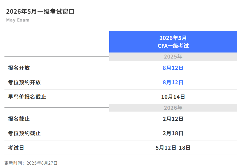 2026年5月CFA®(特许金融分析师)考试窗口已正式开放报名,早鸟价报名(优惠350美元)将于2025年10月14日23:59(北京时间10月15日中午11:59)截止。