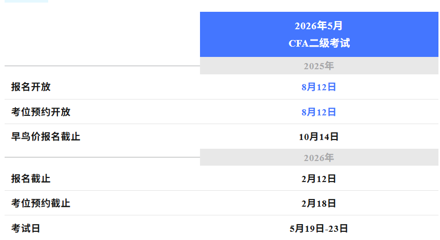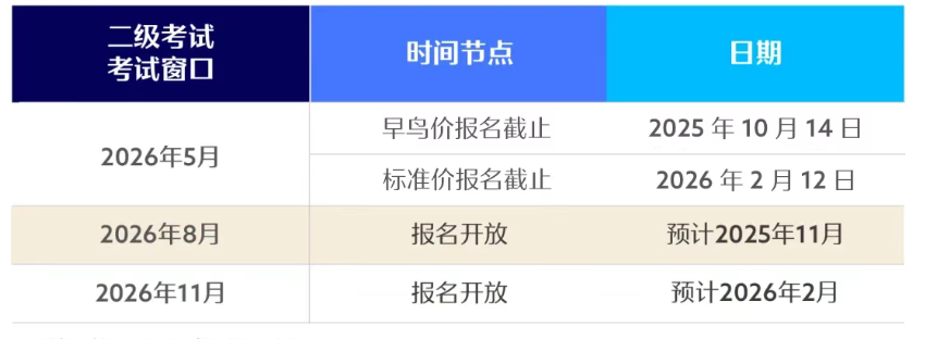 以本科在校生身份参加CFA二级考试的考生,最早可选择处于学士学位课程或同等项目毕业月份前11个月及以内的考试窗口。例如,2026年6月毕业的四年制本科在校生,若已经通过CFA一级考试,最早可报名大三暑假(2025年8月)的CFA二级考试。