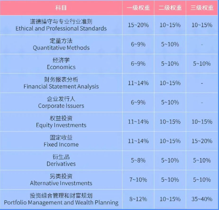 根据2025年考纲,CFA三个级别各科目权重占比区间如下: