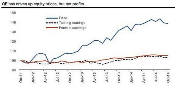 在QE的帮助和怂恿之下,MSCI全球指数在过去三年增长了38%,而据报上市企业获利却仅增长了3%。这与一直遭遇资金短缺的基本面完全不相符。资金短缺的基本面貌似正是引发企业疲软商业模式的原因。