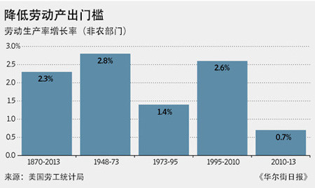 你可能已经注意到较右侧的小柱状图,它只涵盖了三年的时间。三年的时间太短,难以得出任何结论。(加上尚未结束的2014年,结果也不会有什么变化。)但自2010年以来,生产率的增幅只有生产率增长放缓时期(我们之前对表现差的标准)增幅的一半。