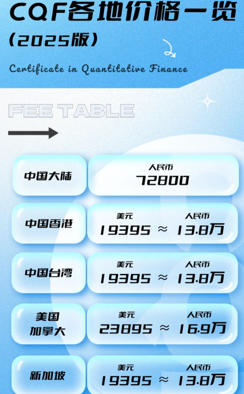 CQF的费用,不同的国家都不太一样,2025班级中国大陆地区报名价上调至¥72800。2026班级中国大陆地区报名价上调至¥73800。