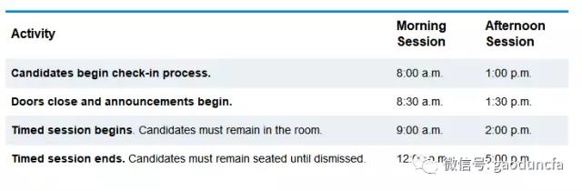 今年准考证打印与往年一样,是在CFA考试考前的一个月左右可以打印,准考证在(2019.11.05)已经可以开始打印了,建议考生多打印几张,以便备用。下面是CFA考试当天的具体时间安排,考生一定要按照规定严格遵守: